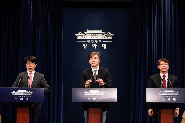 조국 민정수석(가운데)이 21일 대통령 개헌안 중 지방분권 및 총강·경제 관련 요지를 발표하고 있다. 조 수석을 기준으로 우측은 진성준 정무기획비서관, 좌측은 김형연 법무비서관. ⓒ청와대