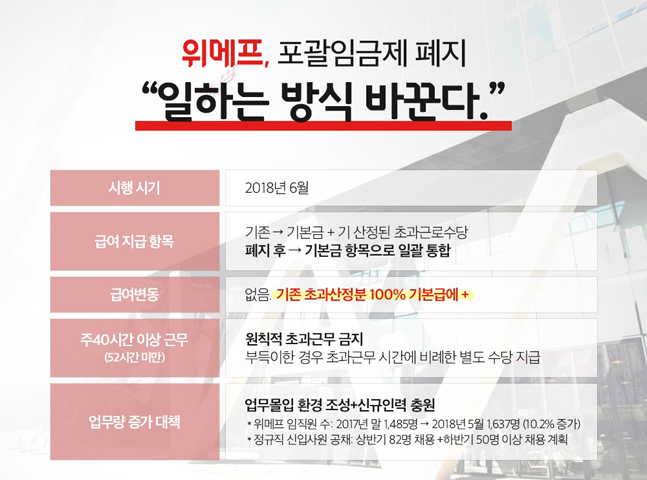 위메프 관계자는 “24시간 운영되는 서비스 특성상 포괄임금제 폐지는 임금 상승 부담이 있지만 포괄임금제 유지가 근로시간 단축의 긍정적 취지와 상충되는 부분이 있어 과감히 현 제도를 폐지하는 게 바람직하다고 판단했다”고 폐지 배경을 설명했다.