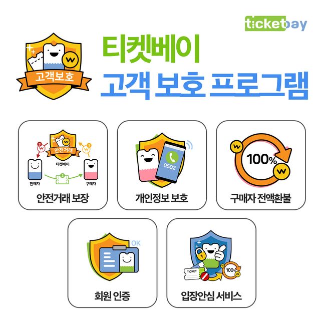 티켓베이는 지금까지 사기사고 발생률 제로(ZERO)를 기록하고 있는 ‘고객 보호 프로그램(Customer Protect Guarantee)’으로 누구나 안심하고 거래할 수 있다.