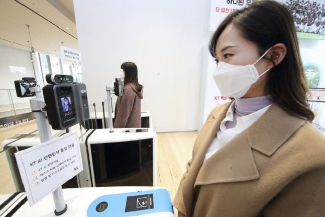 KT는 지난해 11월부터 딥러닝 기반 AI안면인식 기술을 활용한 출입통제 시스템을 서울 광화문 이스트 사옥에 시범 적용해왔다. 3D 기반 안면랜드마크 검출 기술로 정확성을 대폭 높였다. 발열 체크는 기본으로 다양한 모양과 색상의 마스크를 착용해도 출입자의 얼굴 특징을 추출해 인식한다. 1.5m 이내로 위장 여부를 확인하는 안티스푸핑 기능, 얼굴 변화 대응 기능, 얼굴 사진 자동등록 기능 등을 탑재해 보안도 강화했다. 기존 출입 인프라와 연동해 직원 출입 데이터 관리, 엘리베이터 자동 호출까지 가능하다.
