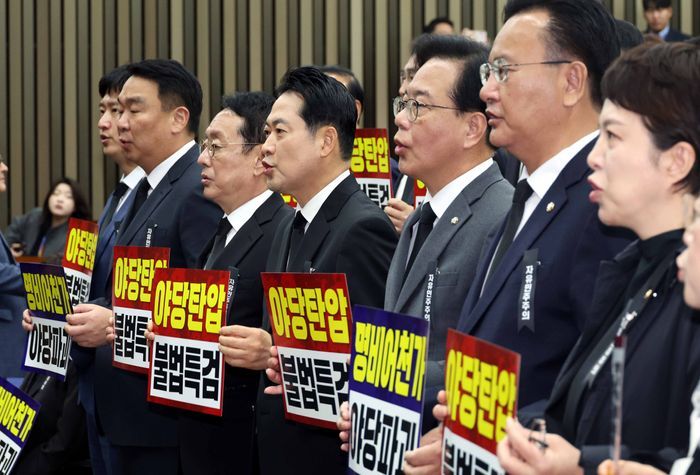 장동혁 국민의힘 대표와 송언석 원내대표를 비롯한 의원들이 4일 오전 국회에서 열린 의원총회에서 손피켓을 들고 구호를 외치고 있다. ⓒ뉴시스