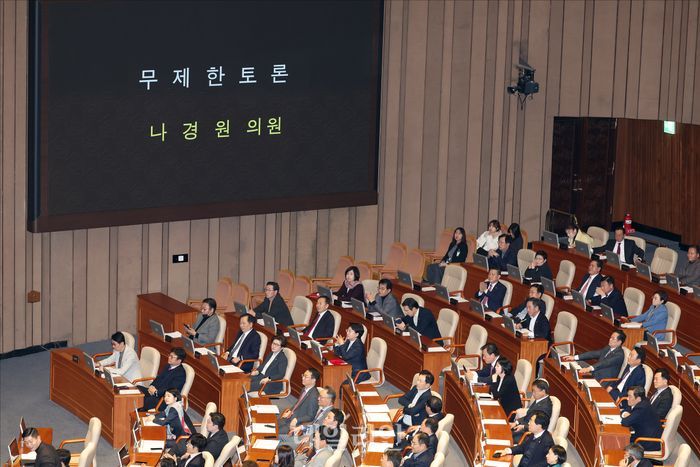 국민의힘이 비쟁점 법안까지 무제한토론(필리버스터)을 예고하며 극한 대치에 들어갔으나, 첫 주자인 나경원 의원과 우원식 국회의장의 충돌로 정기국회 마지막날 본회의장은 야유와 고성이 뒤섞였다. 급기야 우원식 의장이 필리버스터 도중 국회 정회를 선포하면서 여야 대치는 극에 달했다.